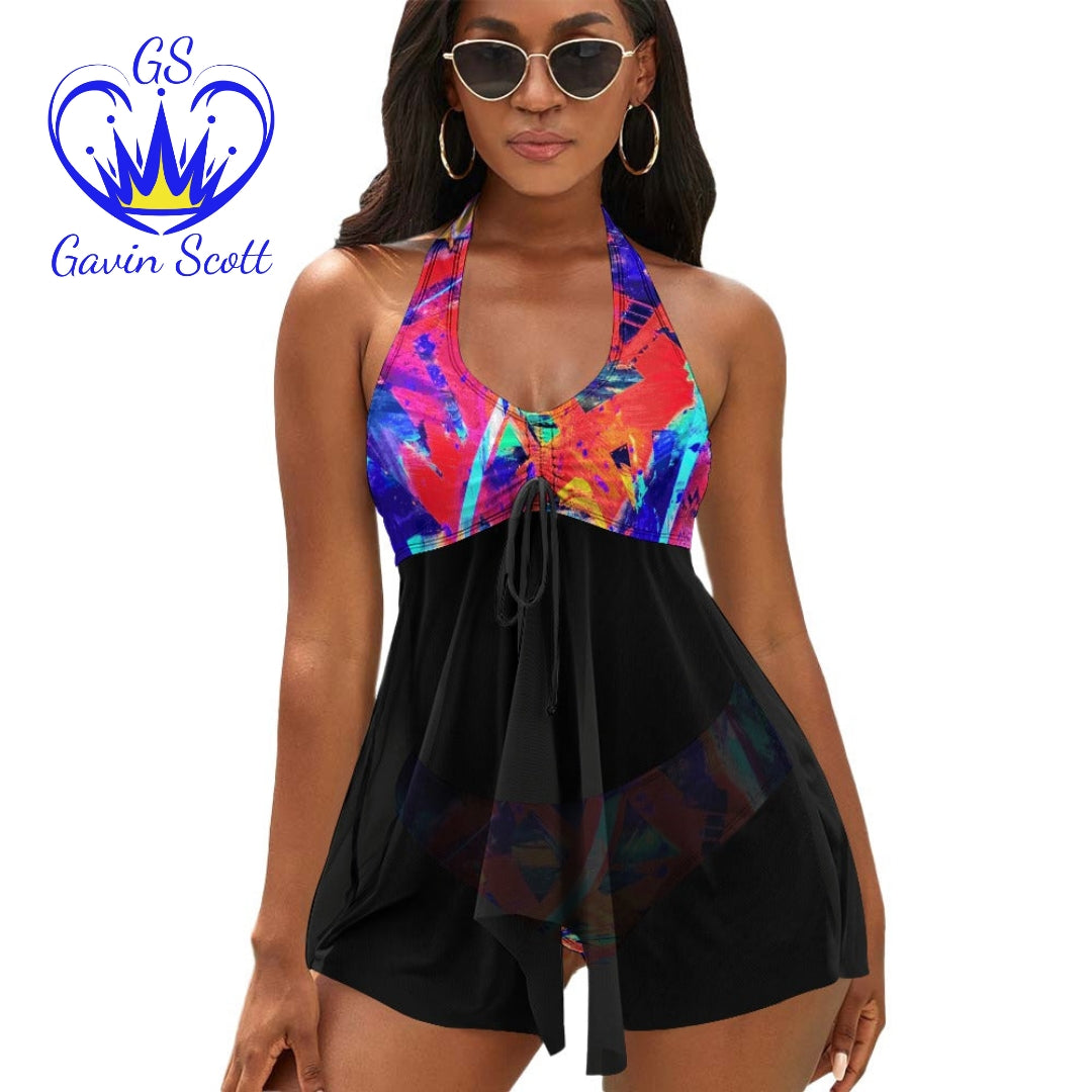 • Abstract print swimwear collection featuring colorful one-piece swimsuits, bikini, and swim shorts