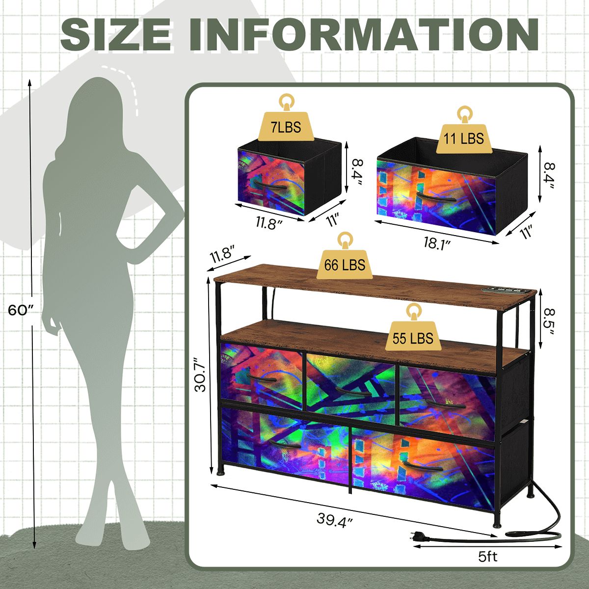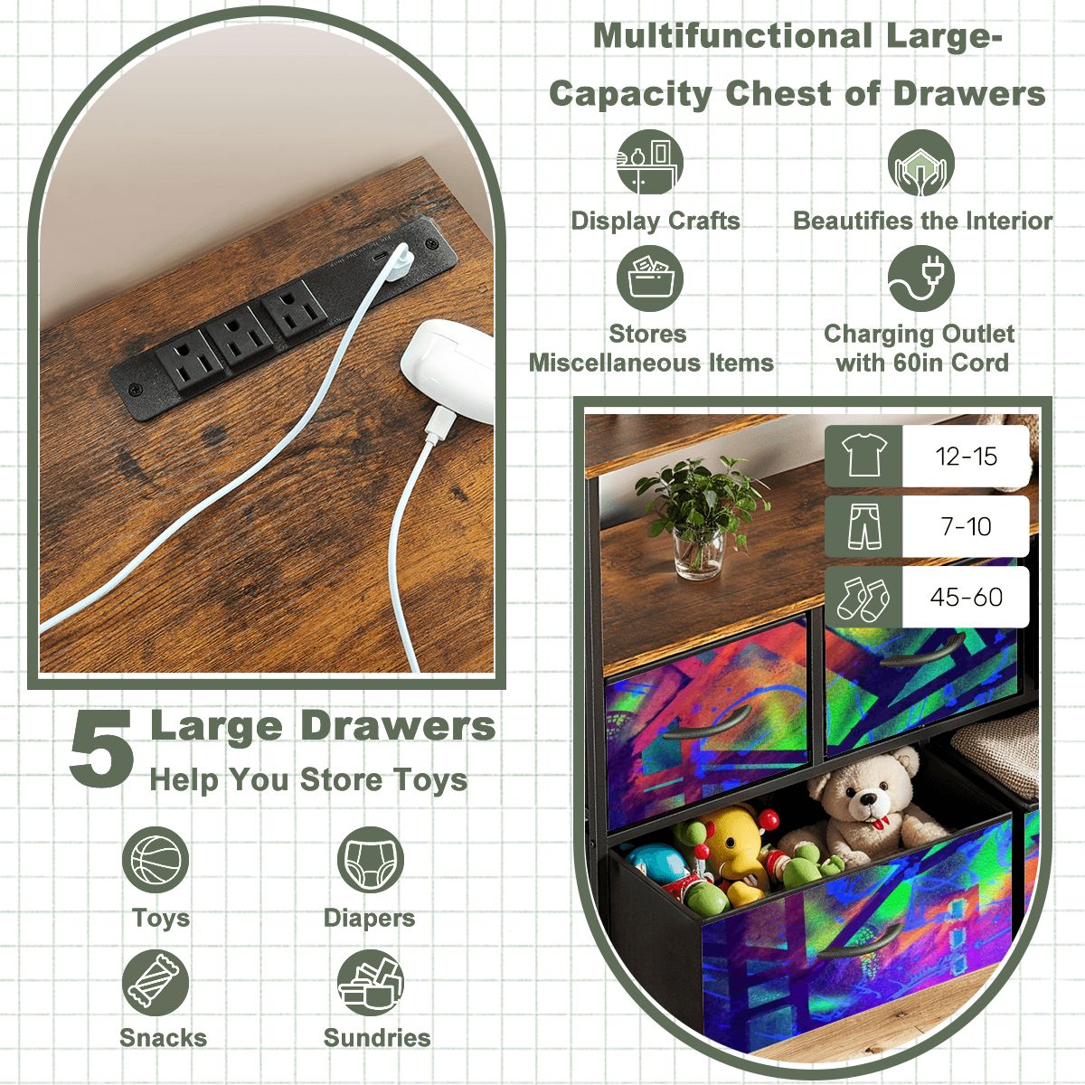 - Package Includes: 1× Installation Manual, 5× Drawers, 2× Wooden Boards, Metal Frame, 5× Handles, 4× Adjustable Feet, Anti-Tip Straps, Hardware Kits, 1× Screwdriver, 1× Built-in Power Outlet.