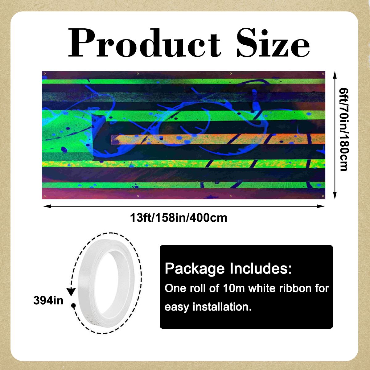 - Features white edge binding and 8 metal grommets (4 at the top and 4 at the bottom) for secure hanging.
