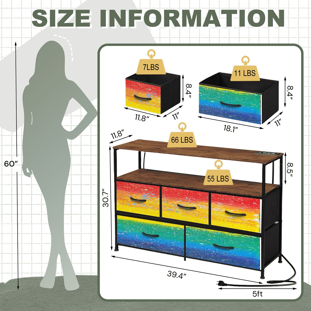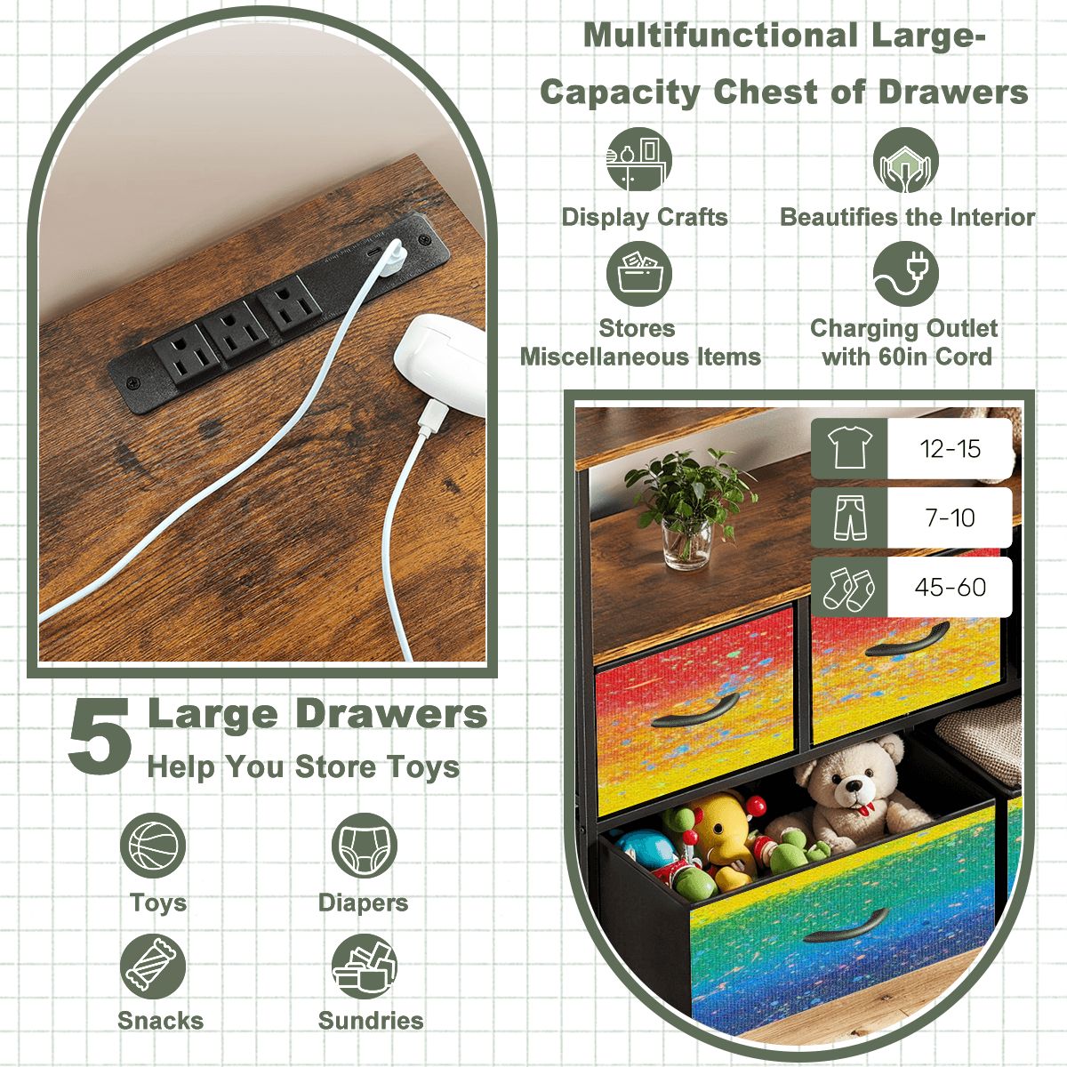 - Package Includes: 1× Installation Manual, 5× Drawers, 2× Wooden Boards, Metal Frame, 5× Handles, 4× Adjustable Feet, Anti-Tip Straps, Hardware Kits, 1× Screwdriver, 1× Built-in Power Outlet.