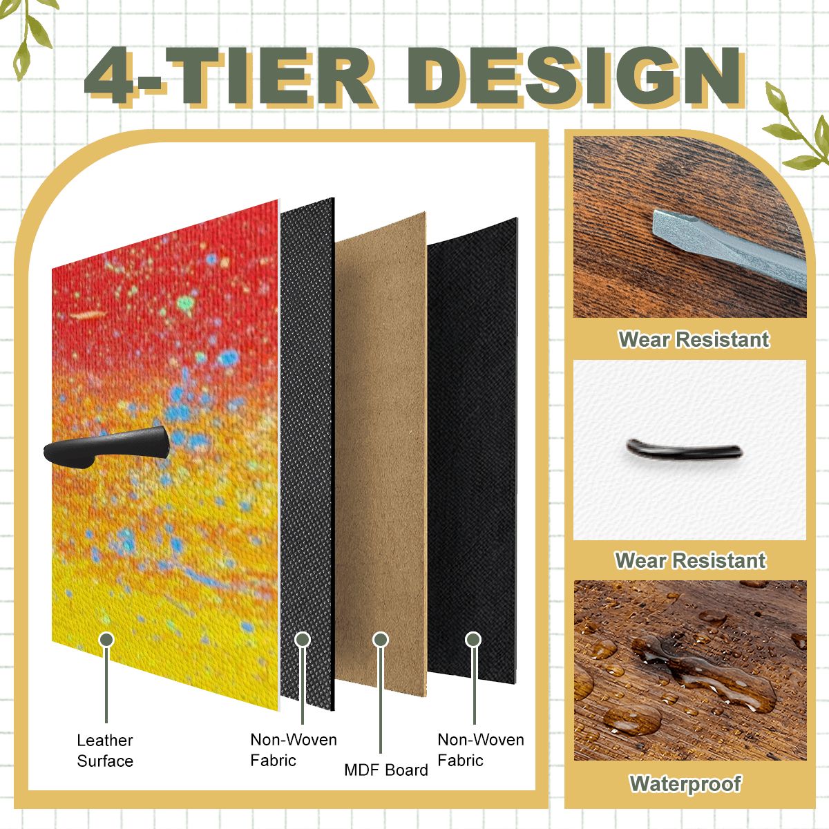 - The design features a layer of leather covering the product's surface.